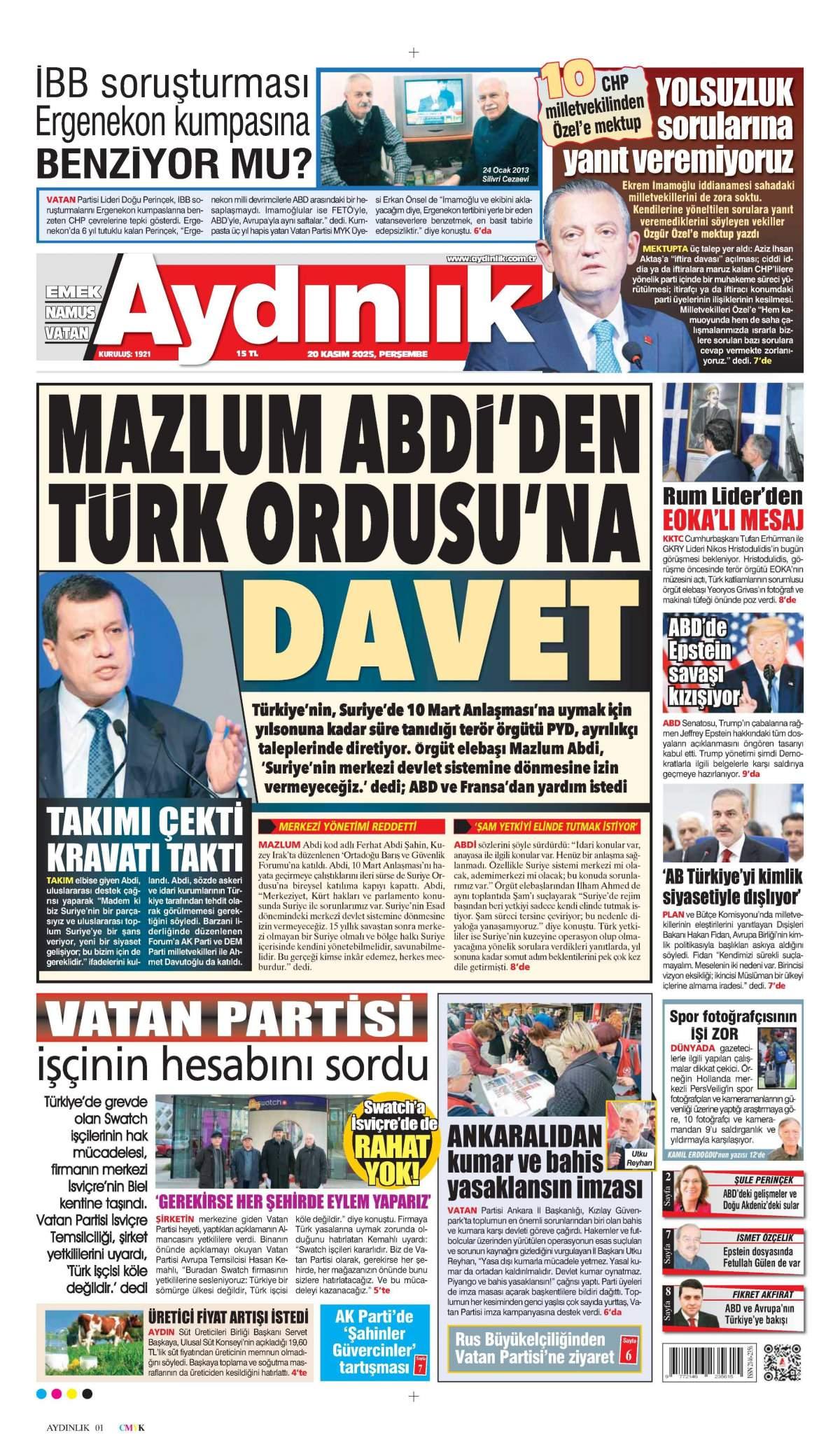 Aydınlık Gazetesi 20 Kasım 2025 Günü Manşeti