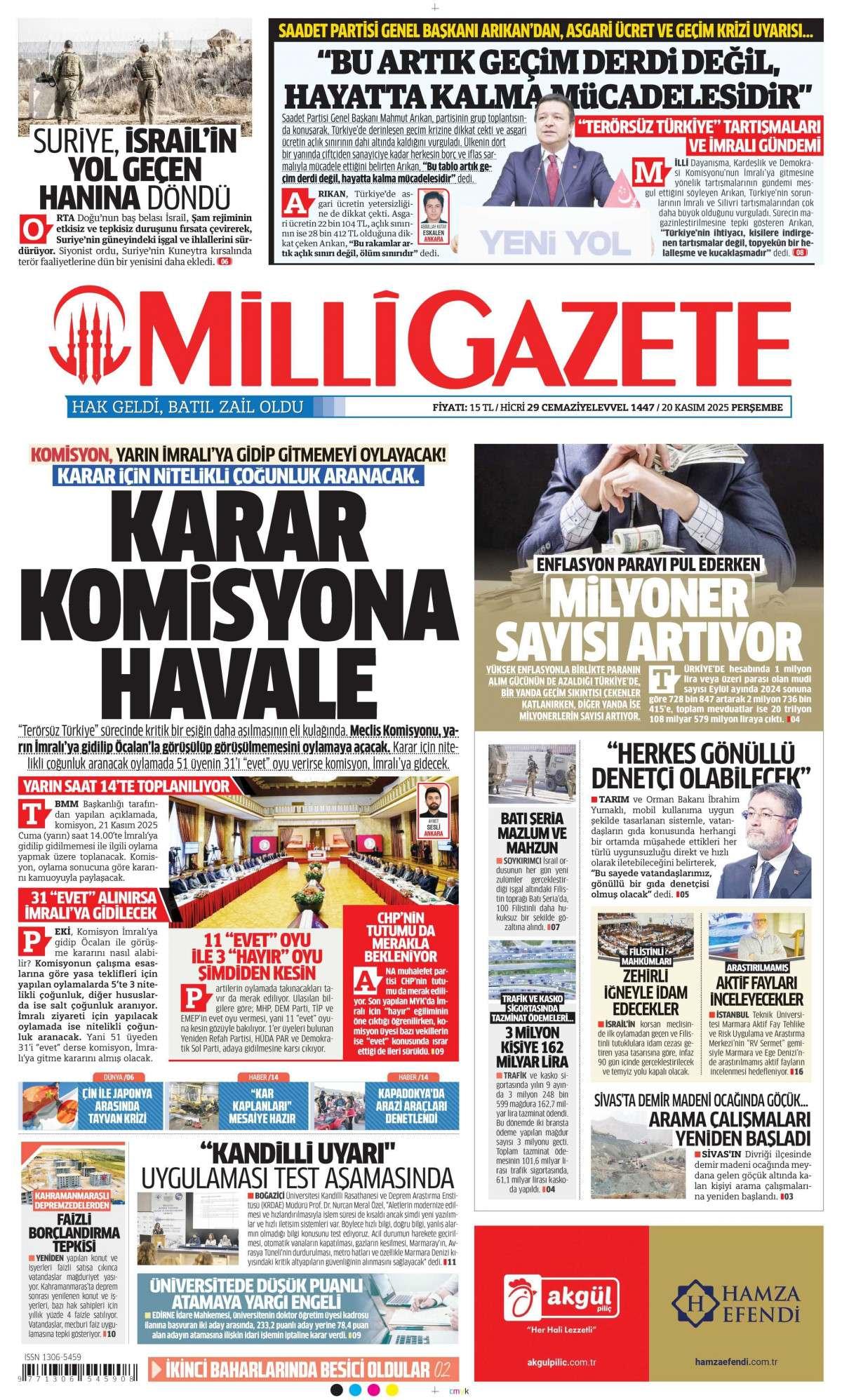 Milli Gazetesi 20 Kasım 2025 Günü Manşeti