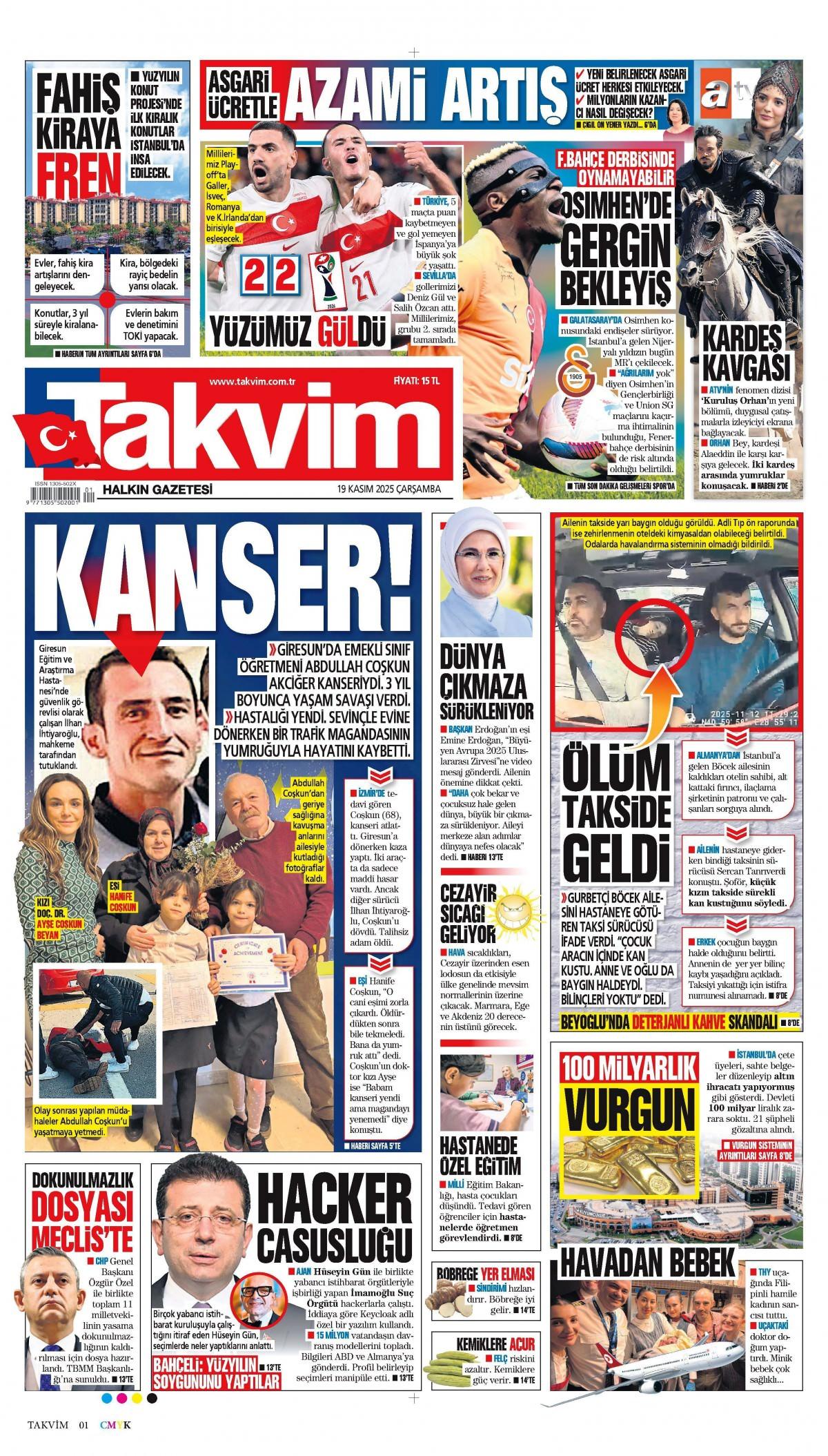 Takvim Gazetesi 20 Kasım 2025 Günü Manşeti